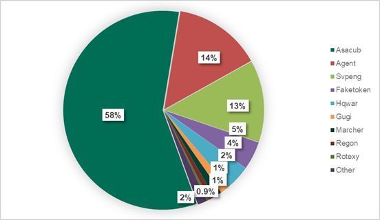 Asacub的峰值超过两倍,接近60%,其次是Agent(14.28%)和Svpeng(13.31%)。这三家公司在2018年都经历了爆炸式的增长,尤其是Asacub,其攻击用户数量从2017年的146,532人升至1125,258人。