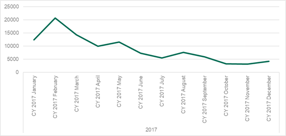 与此同时,Faketoken的活动趋于平稳,其点击率从1月份的13563次逐渐下降到12月份的3872次。