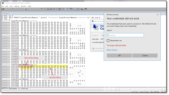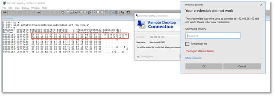 为了确保hook该函数能获取到所需的数据,我们使用Windbg attach到mstsc.exe进程,在CredIsMarshaledCredentialW上设置断点。当用户尝试登录时,可以看到传递给该函数的第一个参数为Unicode字符串的地址: