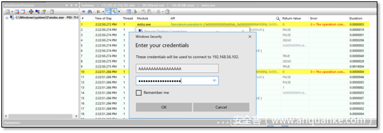 为了完成任务,我们在mstsc.exe上执行API监控操作,然后初始化一个RDP示例连接。