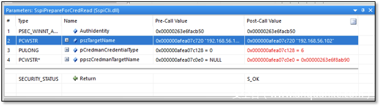 采用同样的思路,我们可以定位到SspiPrepareForCredRead,该API的第2个参数即为我们需要提取的IP地址。