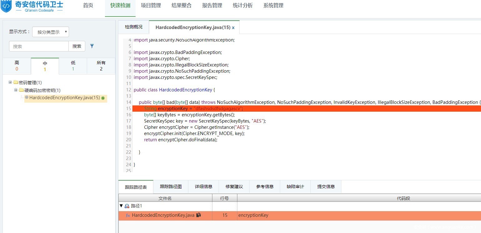 上述代码操作是使用硬编码密钥对原文进行加密的过程。首先第15行给定一个密钥字符串,16~17行根据给定的密钥字节数组和AES算法构造一个密钥对象,第18行同样使用AES算法实例化加密类。第19行使用加密模式对密钥对象进行初始化。第20行通过加密操作,返回加密后的字节数组。当程序中使用硬编码加密密钥时,所有项目开发人员都可以查看该密钥,甚至如果攻击者可以获取到程序class文件,可以通过反编译得到密钥,硬编码加密密钥会大大降低系统安全性。使用代码卫士对上述示例代码进行检测,可以检出“硬编码加密密钥”缺陷,显示等级为中。在代码行第15报出缺陷,如图1所示: