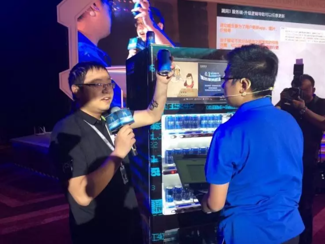破解自动售货机倒是无心插柳,百度安全当时赞助了 Xpwn 2016 大会,市场部的同学们心想既然赞助了也搞点破解,一打听,据说这个小灰灰还挺懂,就买了台自动售货机放在走道里让他破解。当时这位市场部同事的想法是,能破解就上,破不了,走道反正缺个自动售卖机,没事买买饮料咖啡。