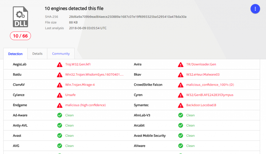 网上有很多关于APT15及其活动的文章和研究,最近的文章和研究来自NCC Group。虽然发布于2018年3月,但它分析的是2017年的一起活动。此外,尽管2017年的活动已经被记录在案,但在Intezer团队关于MirageFox的研究中,发现了一个最近上传的二进制文件(2018年6月8日)与NCC Group文章中提到的RAT非常相似。在VirusTotal上的66款防病毒软件中,仅有7款(7/66)将它检测出来。