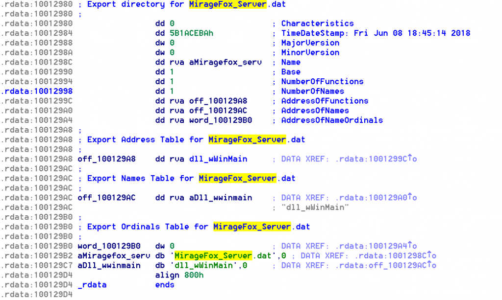首先,之所以将其命名为MirageFox而不是Mirage,是因为在模块的Export目录中,name字段被字符串MirageFox_Server.dat填充。