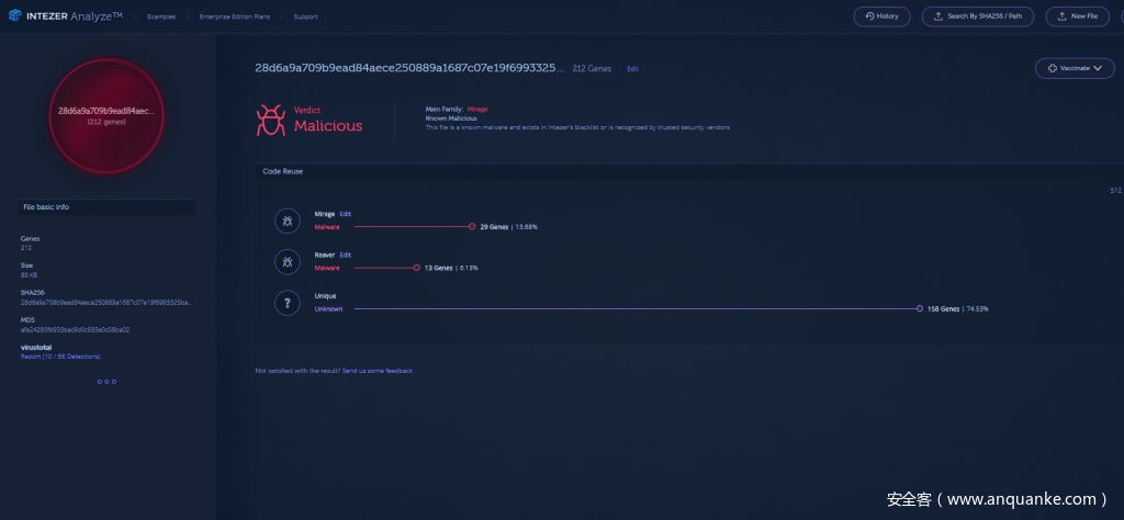 在VirusTotal上,我们可以看到,只有10/66检测出这个二进制文件,11/66检测出MirageFox的另一个类似版本(SHA256:97813e76564aa829a359c2d12c9c6b824c532de0fc15f43765cf6b106a32b9a5),9/64检测出已上传的第三个MirageFox二进制文件(SHA256:b7c1ae10f3037b7645541acb9f7421312fb1e164be964ee7acd6eb1299d6acb2)。