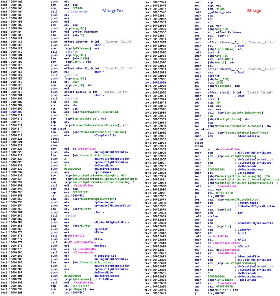 以下是在Mirage家族中发现的几个代码重用相似点的例子,它们分别出现在较新的二进制文件和较旧的二进制文件中。