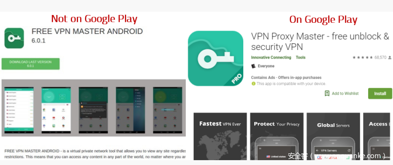 挂载在恶意网页上的伪造的软件(左侧)与Google Play商店中的合法VPN应用程序(右侧)十分相似。