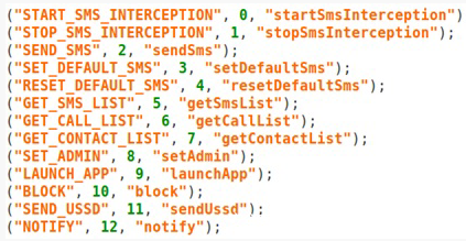 恶意软件可以执行各种命令,例如在用户不知情的情况下拦截或发送文本消息、获取受害者通讯录信息、拨打电话、窃取用户短信信息、发送电话网络功能代码(USSD代码)。