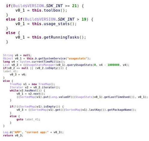 由于这个木马依赖的是覆盖机制,所以它必须知道当前用户手机中的应用程序列表才能开始执行。这样做的目的不仅是为了确定特定应用程序的使用是否允许他们收集另一个凭证,也是为了使每个目标程序都可以对应覆盖到指定程序上,以便其能拦截和窃取用户数据。由于这个确定当前运行程序的行为是覆盖恶意软件是否成功的标志,所以我们将仔细研究它是如何完成的。