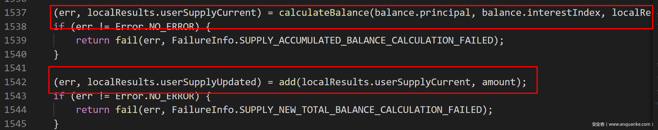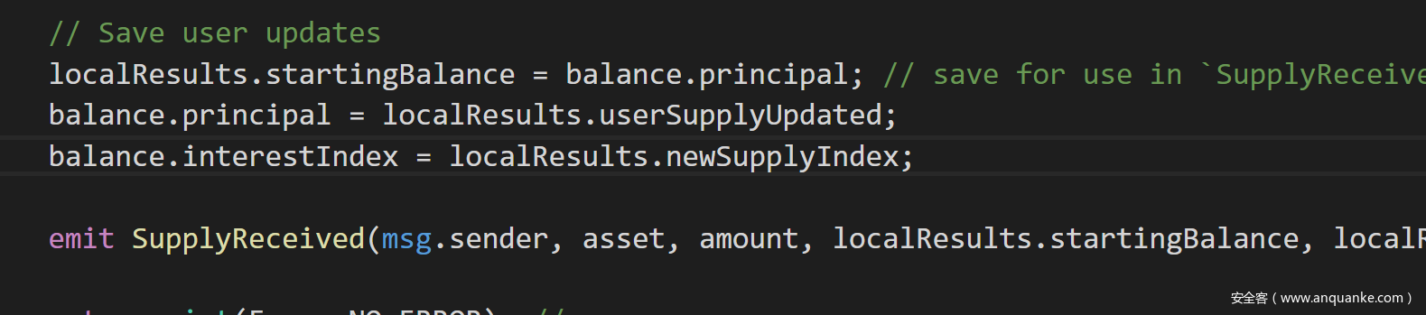 1.supply()函数中,将用户当前余额存入临时变量。此处将用户余额存入到localResults.userSupplyUpdated。