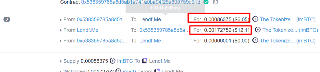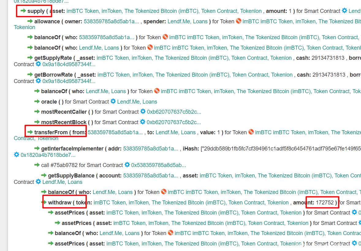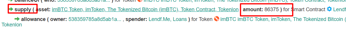 到bloxy.info上查看该交易 ,我们能知道完整的交易流程。如下图,有两个supply()函数,其中一个是存入0.00086375imBTC。下面一个supply()函数先存入0.00000001个imBTC,在transferFrom下的withdraw()函数提取了0.00172752imBTC