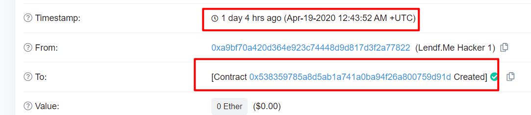 攻击者地址:0xA9BF70A420d364e923C74448D9D817d3F2A77822。2020年4月19日12点43分,攻击者地址创建了攻击合约0x538359785a8d5ab1a741a0ba94f26a800759d91d。