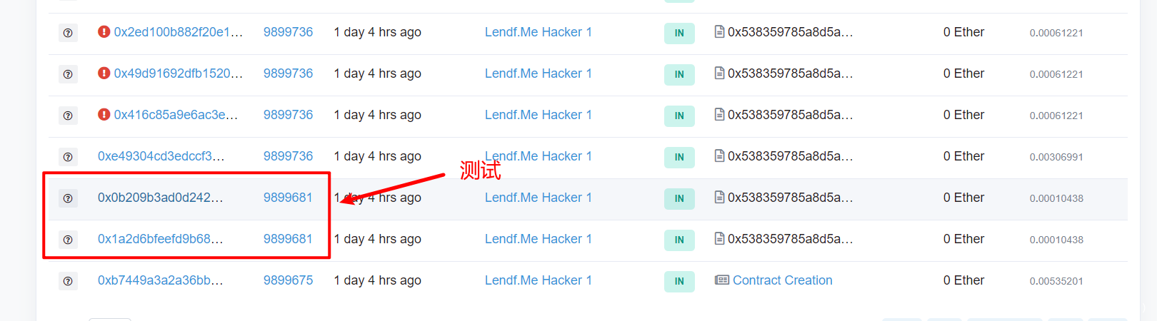 在etherscan上查看攻击合约地址的交易记录。发现前两条都是测试,从第三条开始攻击。