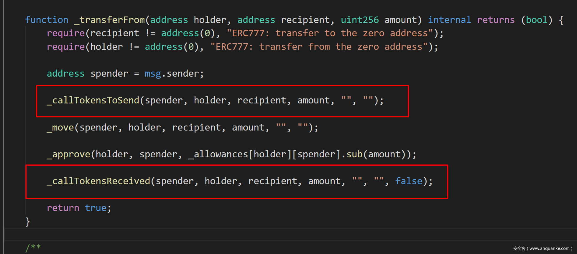 imBTC的transferFrom代码如下图。这里callTokensToSend与callTokensReceived就是前面在ERC777协议里讲到的tokensToSend 和tokenReceived 。tokensToSend由用户实现,攻击者利用callTokensToSend的hook功能,调用了LendF.Me的withdraw()函数(由前面的bloxy.info分析知)