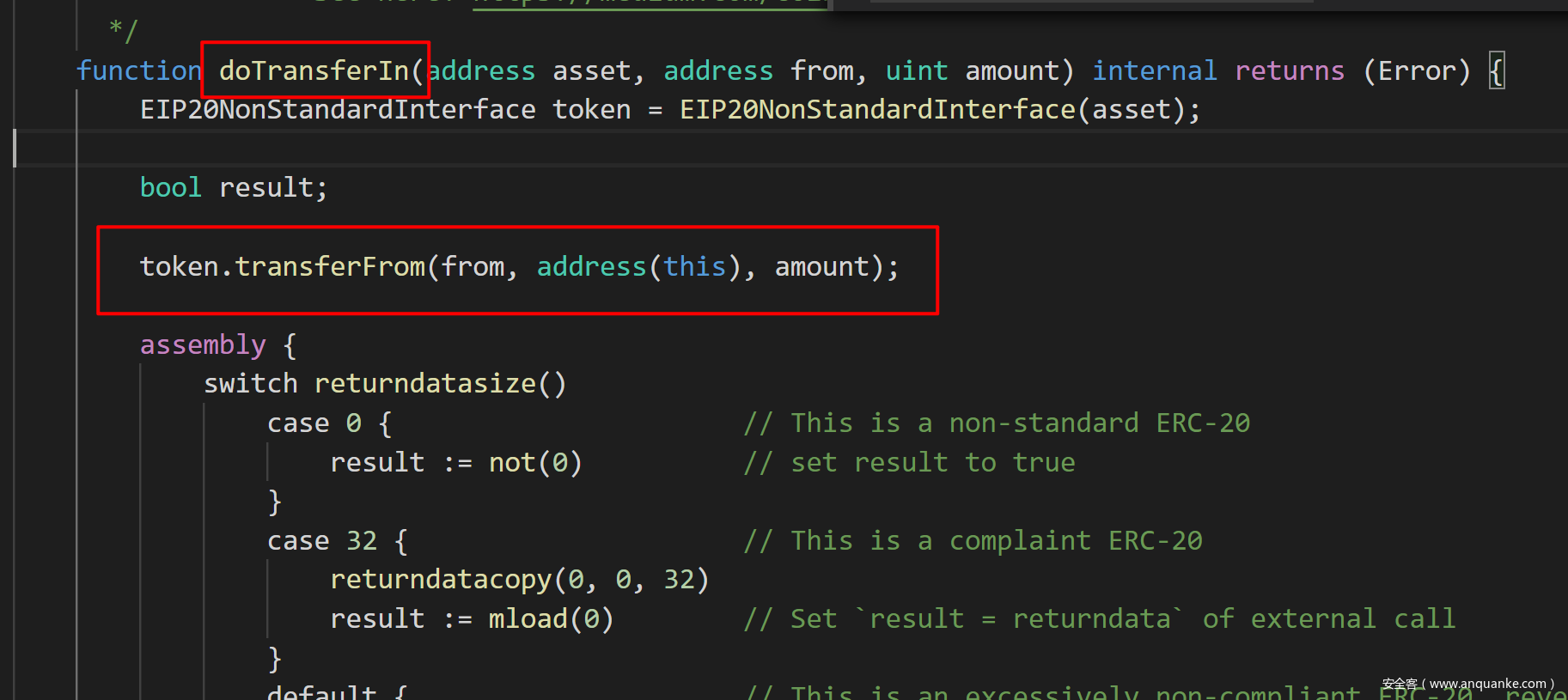 追踪doTransferIn函数,发现调用了token的tansferFrom函数。