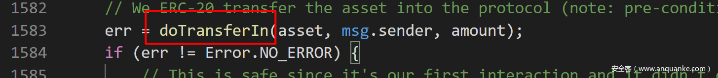 2.调用了token的TransferFrom函数。这里,同样是在supply函数中,第1583行,使用了doTransferIn()。
