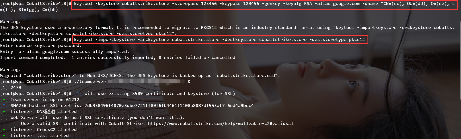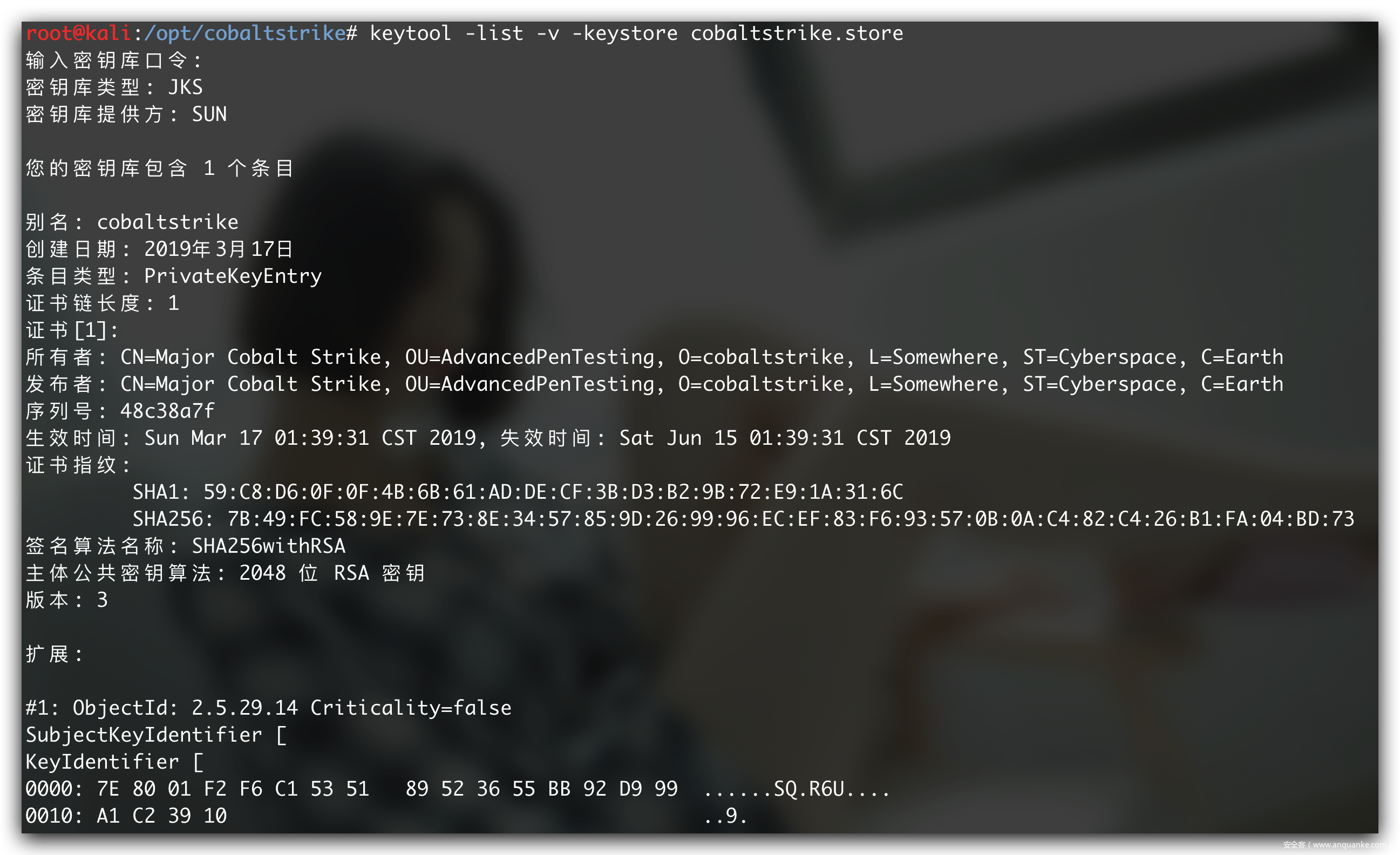 服务器端使用的证书CobaltStrike.store,为了掩盖默认SSL证书存在的特征,需要重新创建一个新的不一样的证书 。使用以下命令创建证书: