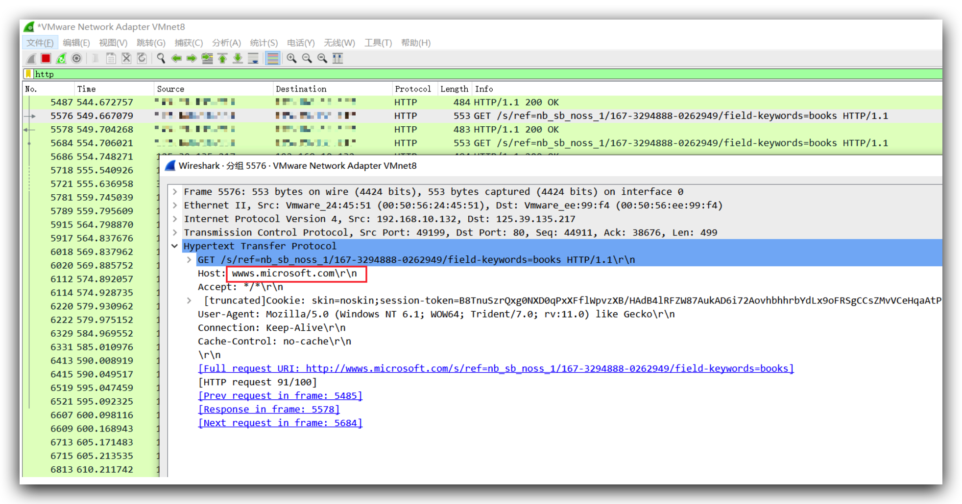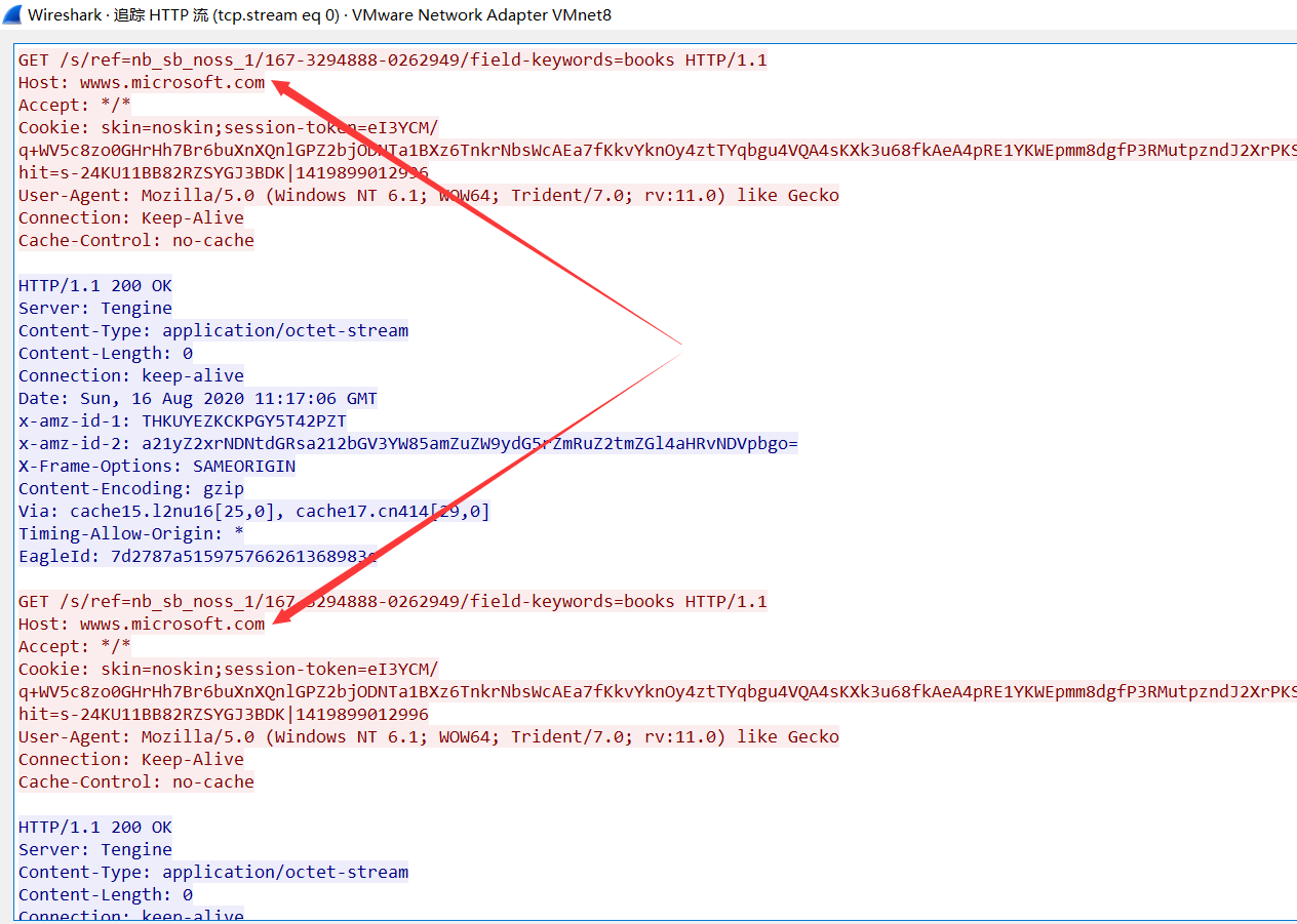 并且使用 wireshark 抓包,可以看到访问的是我们在申请CDN时配置的 wwws.microsoft.com 这个高信任域名。(如下的包得是配置80端口才能抓到,443端口流量加密的抓取不到)