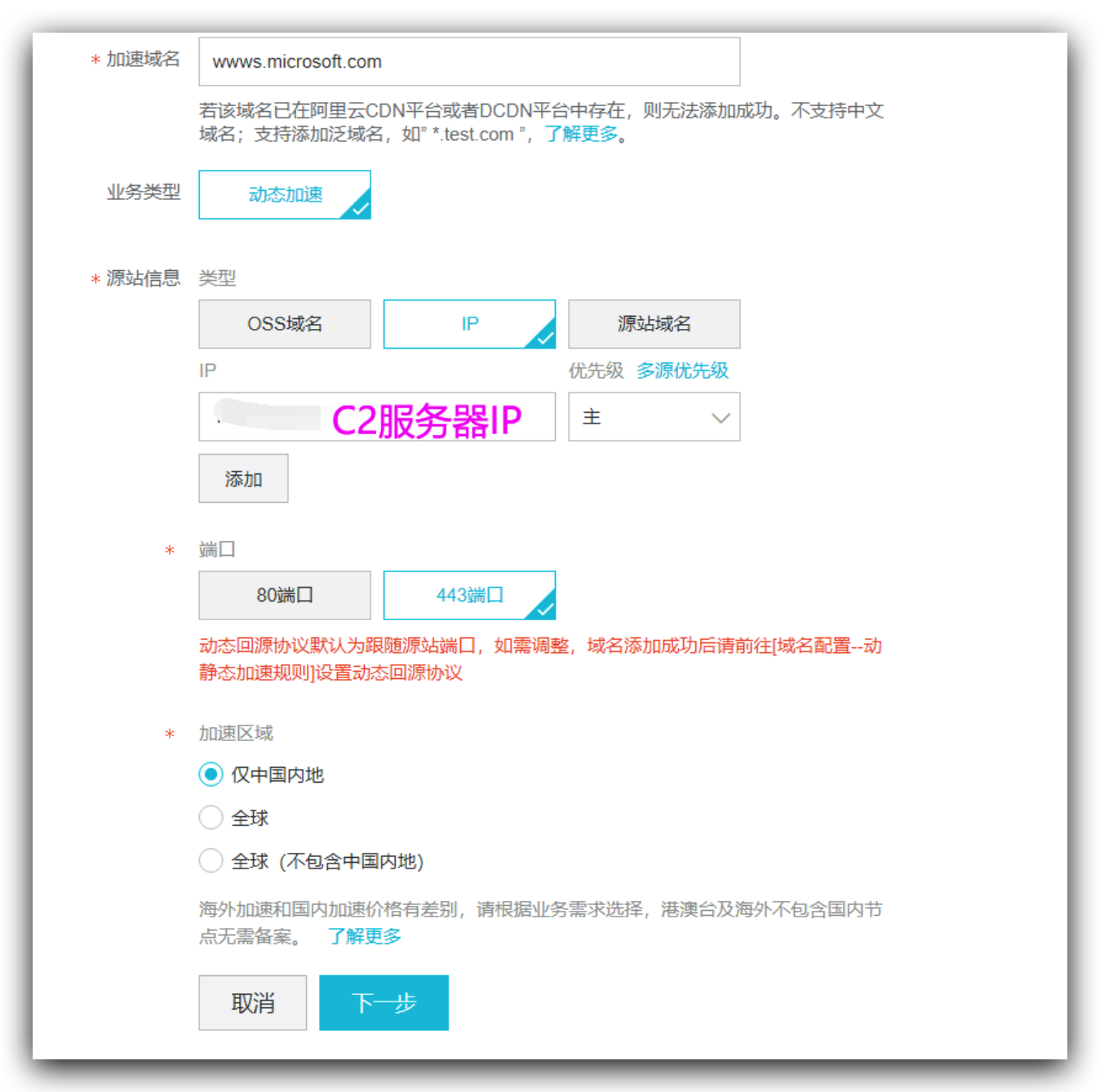 但由于某云有一个有趣的特点:当 CDN 配置中的源 IP 为自己云服务器时,加速时会跳过对域名的检验,直接与配置中的域名绑定的源服务器IP进行通信。利用该特性,我们不需要去申请域名,也不需要配置该域名的CNAME记录了。换言之,只要我们的C2服务器属于某云的服务器,那么我们就无需申请域名,只需要在申请 CDN 时随便填一个没有人绑定过的域名就行,而且这个域名我们可以填成任何高信誉的域名,例如 test.microsoft.com、wwws.microsoft.com 等。