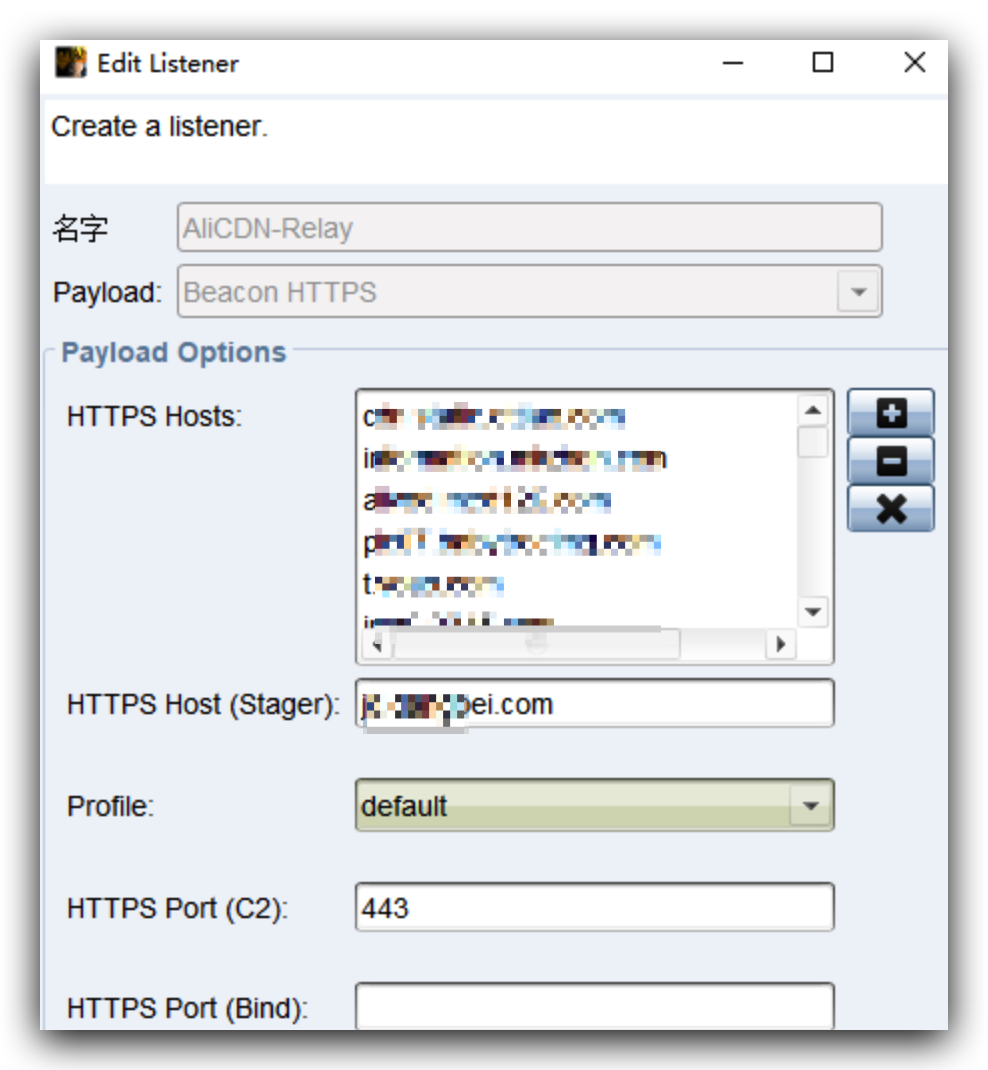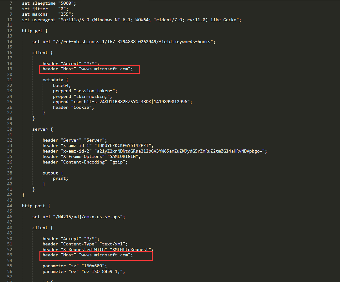 CDN 申请完成后,就可以开始编辑 Cobalt Strike 要用到的 C2 Profile 文件了,我们直接使用开源项目 Malleable-C2-Profiles 中的 amazon.profile,但需要把其中的 Host 头改成我们自己在 CDN 中绑定的域名,如图: