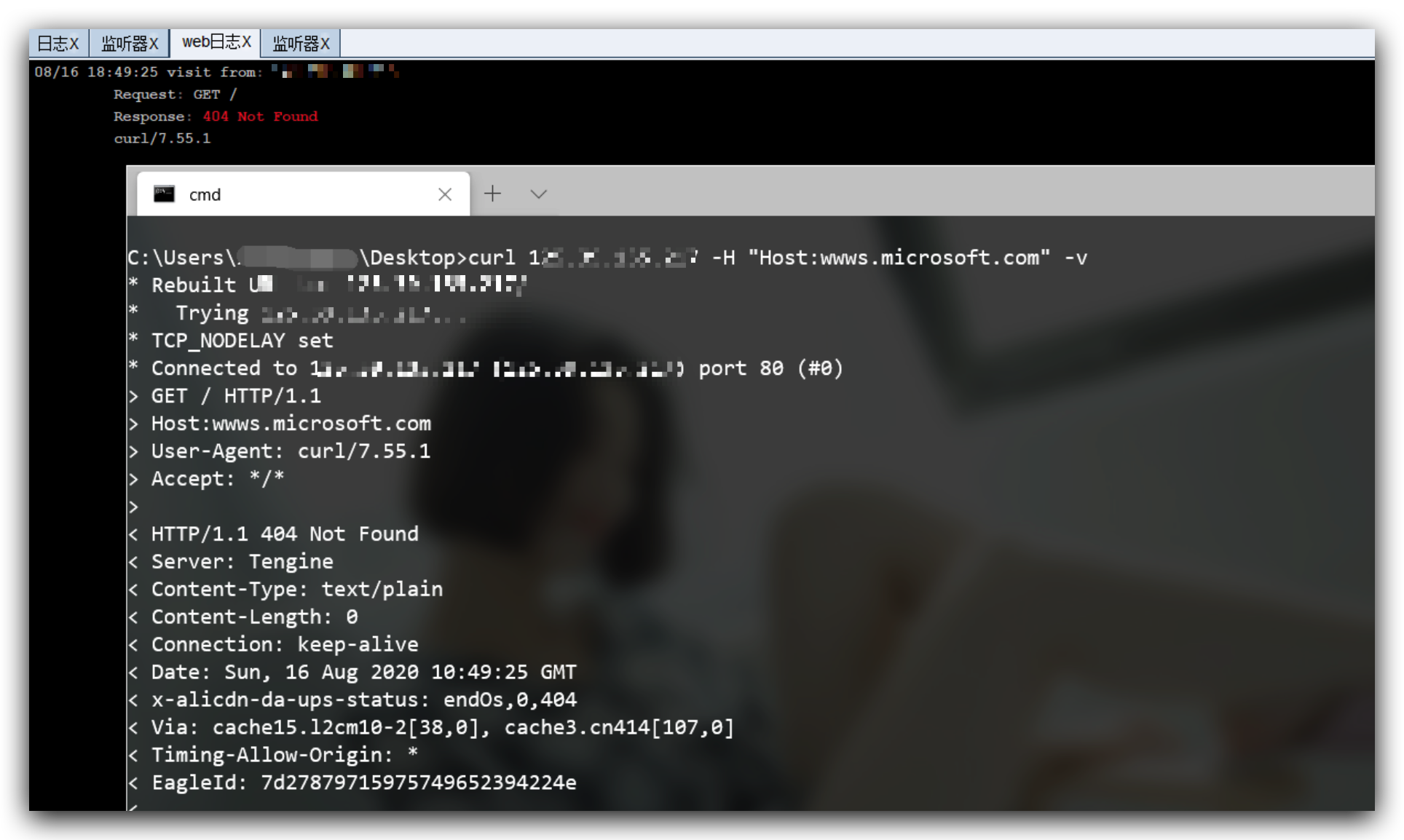 打开web日志试图,请求CDN服务器ip然后指定Host头部,可以看到web日志有响应