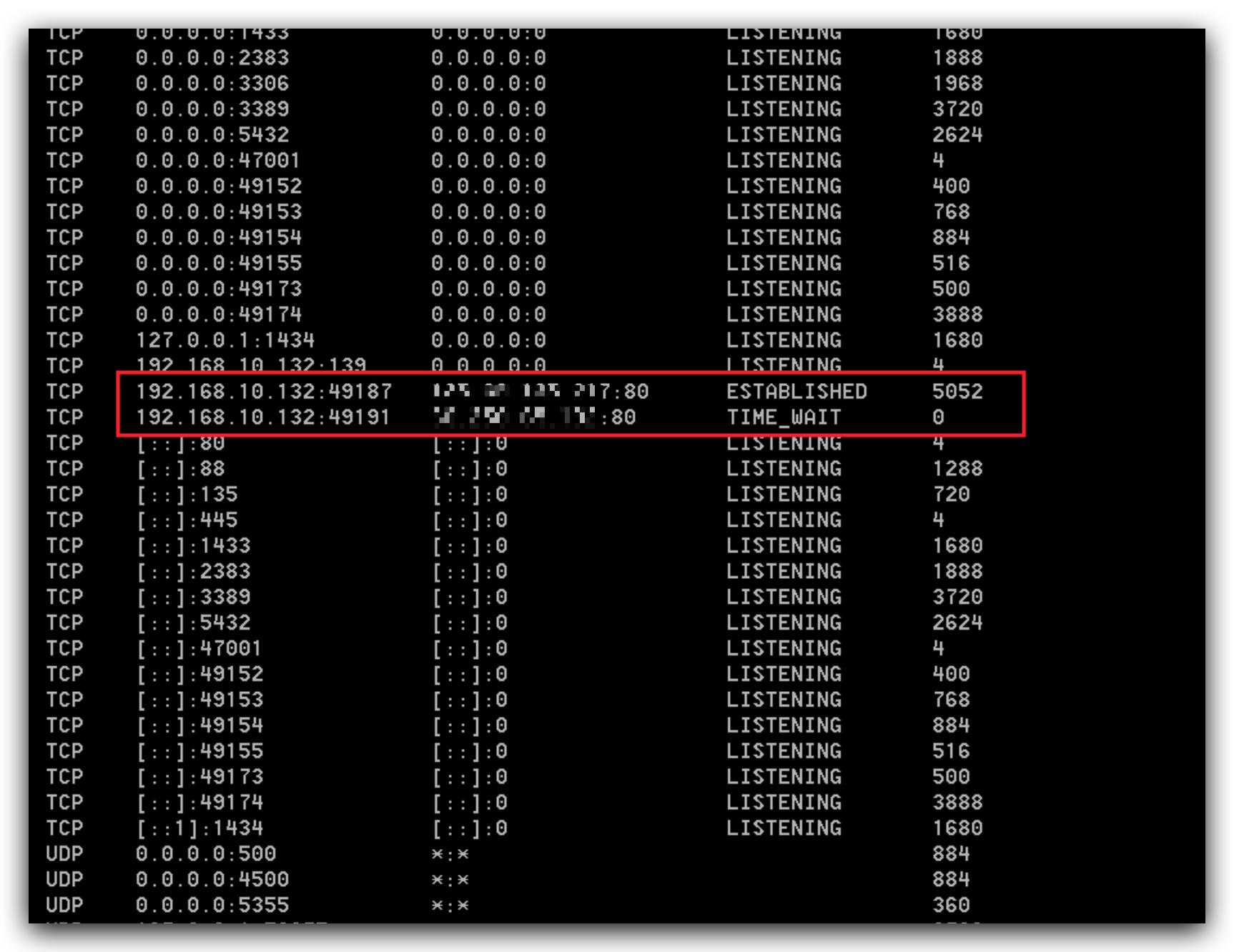 在目标机器上执行 netstat -ano 命令查看端口连接,只能看到该机器与某云CDN的ip进行连接,即使封锁了该ip,仍然会与CDN其他ip进行连接,这样就永远无法阻断与C2服务器的连接了