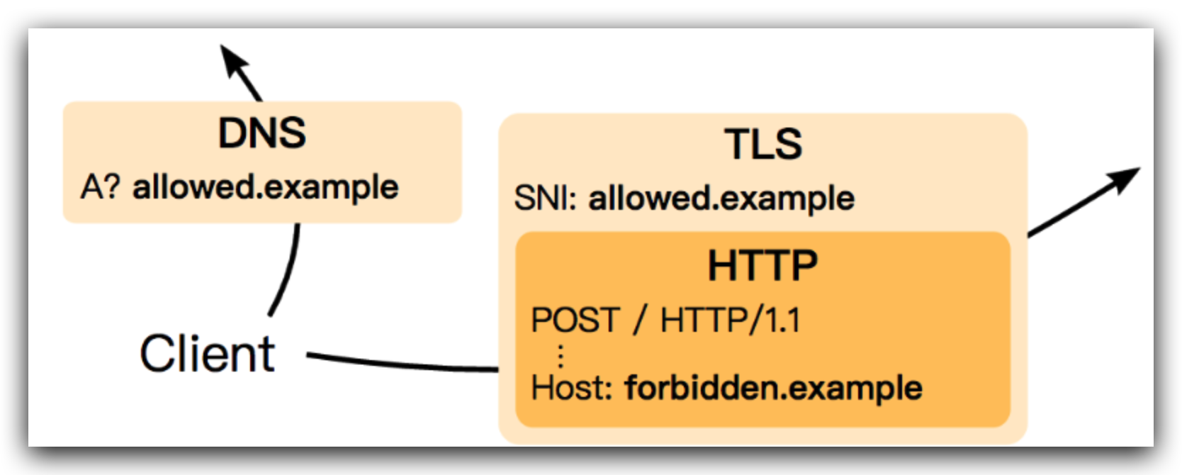 在HTTP(S)请求中,目标域名通常显示在三个关键位置:DNS查询,TLS(SNI)拓展及HTTP主机头中。通常,这三个地方都会是我们要访问的域名地址,然而,在”Domain Fronting”请求中,DNS查询以及SNI携带了一个域名(前域),而在HTTP host头中携带了另一个域名(隐蔽的,被禁止访问的域名),简单的图例如下: