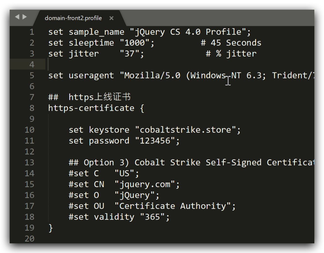 Valid SSL Certificates with SSL Beacon 这里是叫我们使用有效的证书。我们可以使用之前修改过的cobaltstrike.store,也可以使用从其他地方弄过来的证书