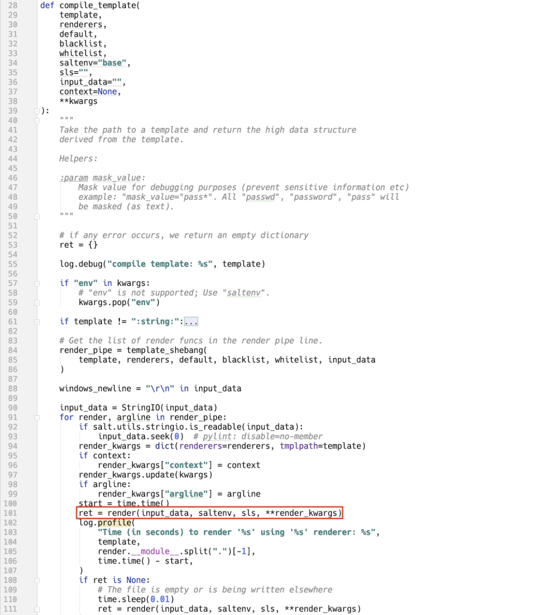 salt/salt/template.py:compile_template() ⇒ salt/salt/utils/templates.py:JINJA() ⇒ salt/salt/utils/templates.py:wrap_tmpl_func() ⇒ salt/salt/utils/templates.py:render_jinja_tmpl()