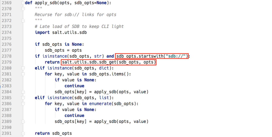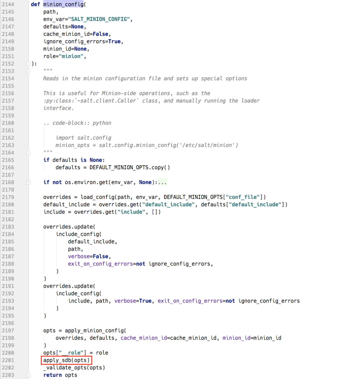 但自动加载的逻辑中未加载master的配置文件,但经过翻找,发现某个方法调用了master_config方法,master_config和minion_config一样,都调用了apply_sdb()方法,从而能够实现未授权RCE。