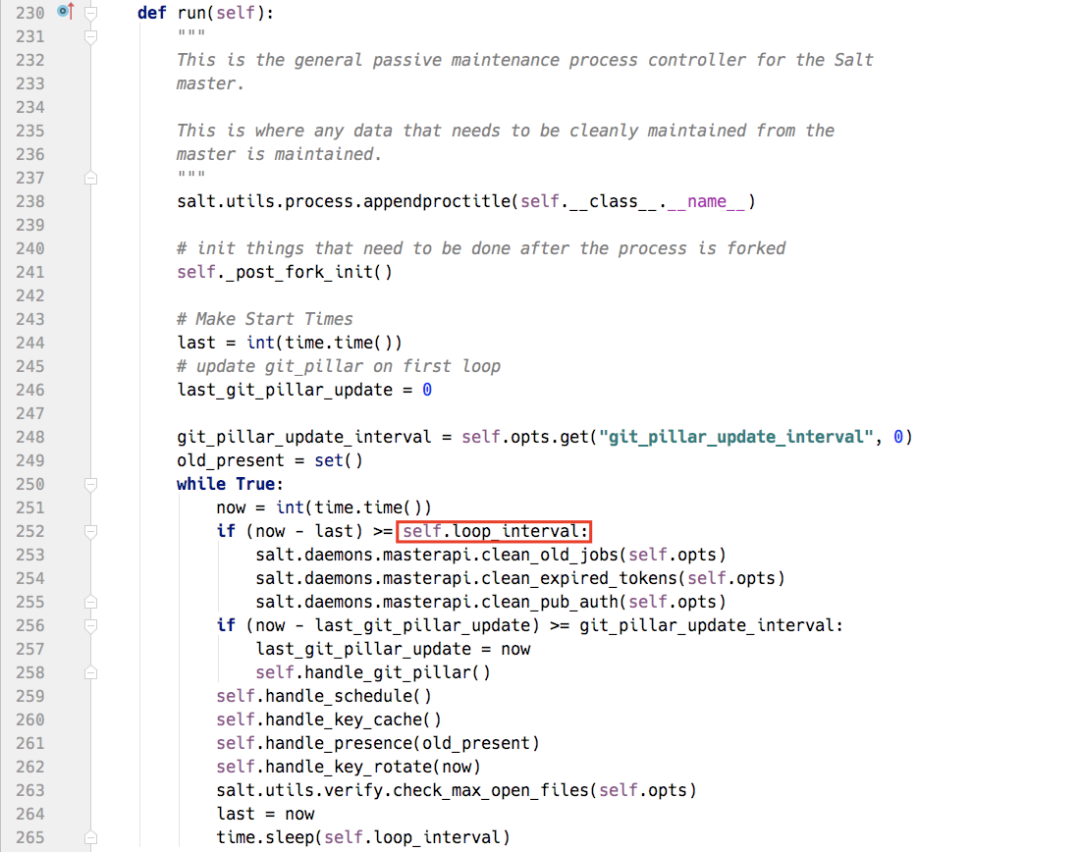 从代码中可以看出,每一个self.loop_interval将循环一次,loop_interval在配置文件中可以配置,默认为60s。通过debug发现在salt.daemons.masterapi.clean_old_jobs中读取minion配置文件。