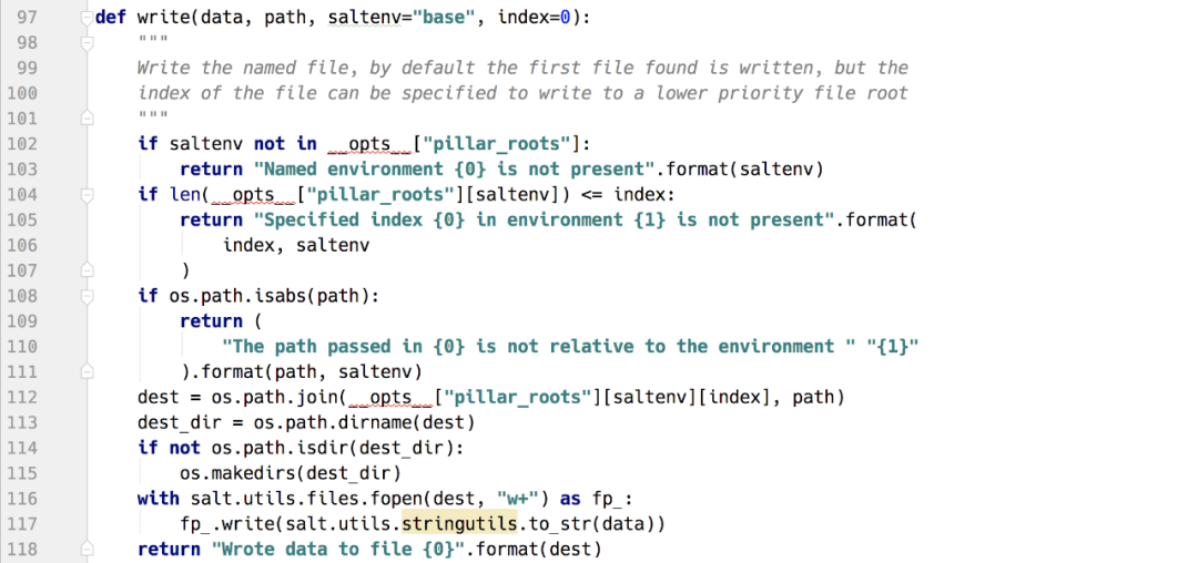 其中salt/salt/wheel/pillar_roots.py:write()方法存在任意写入文件漏洞,不过需要__opts__[“pillar_roots”]中的路径存在。