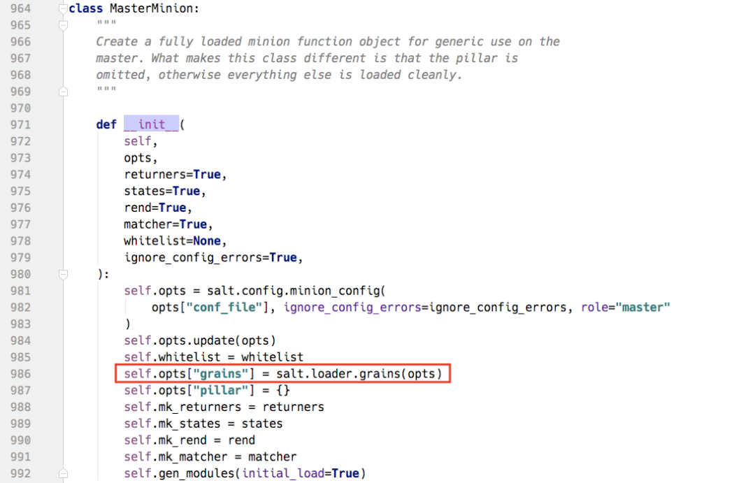 在 salt/salt/minion.py:MasterMinion.init()中发现,自动加载值加载grains相关的参数,grains为saltstack收取各个minion中系统信息的功能。