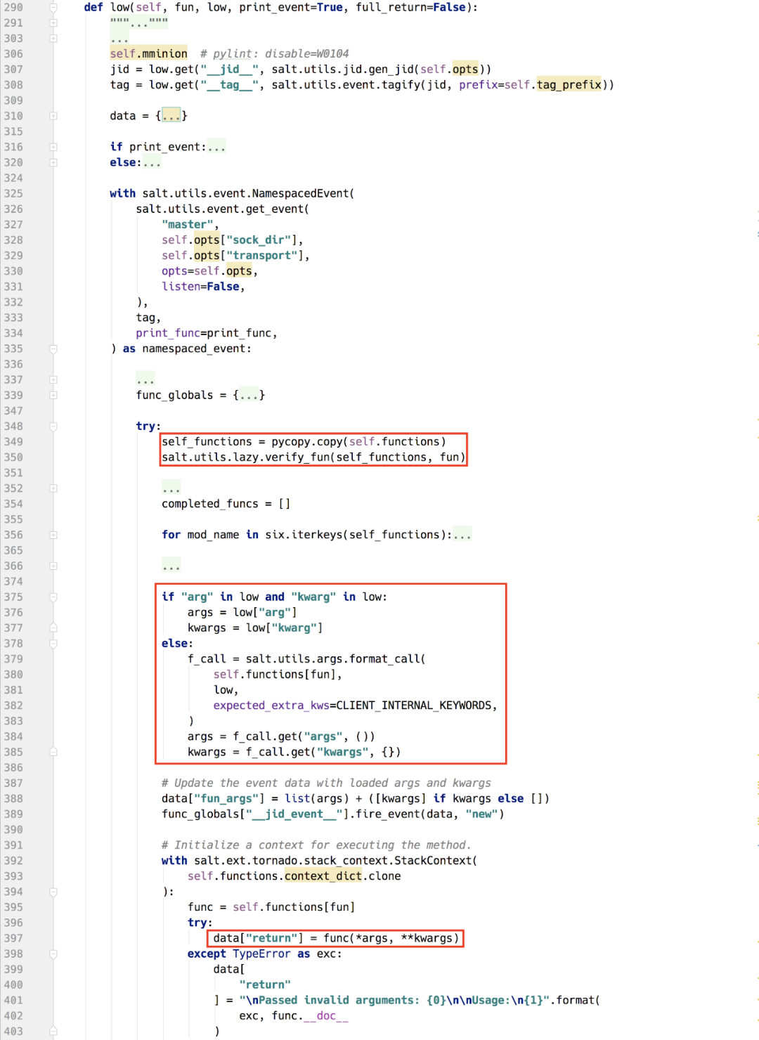 可以发现 ,补丁通过调用认证模块对SSH方法进行权限认证,而salt/salt/netapi/init.py:NetapiClient.run()方法通过getattr动态调用NetapiClient类中的方法,并将args和kwargs作为参数传入。