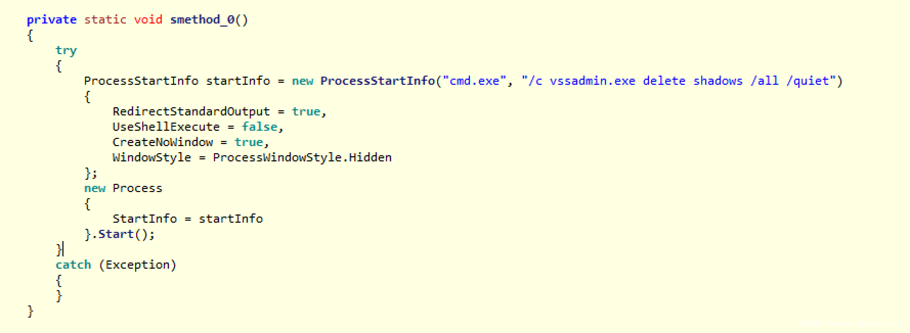 在完成所有这些之后,它所做的最后一件事就是调用smethod_0,删除阴影卷以防止用户用作Windows还原点。