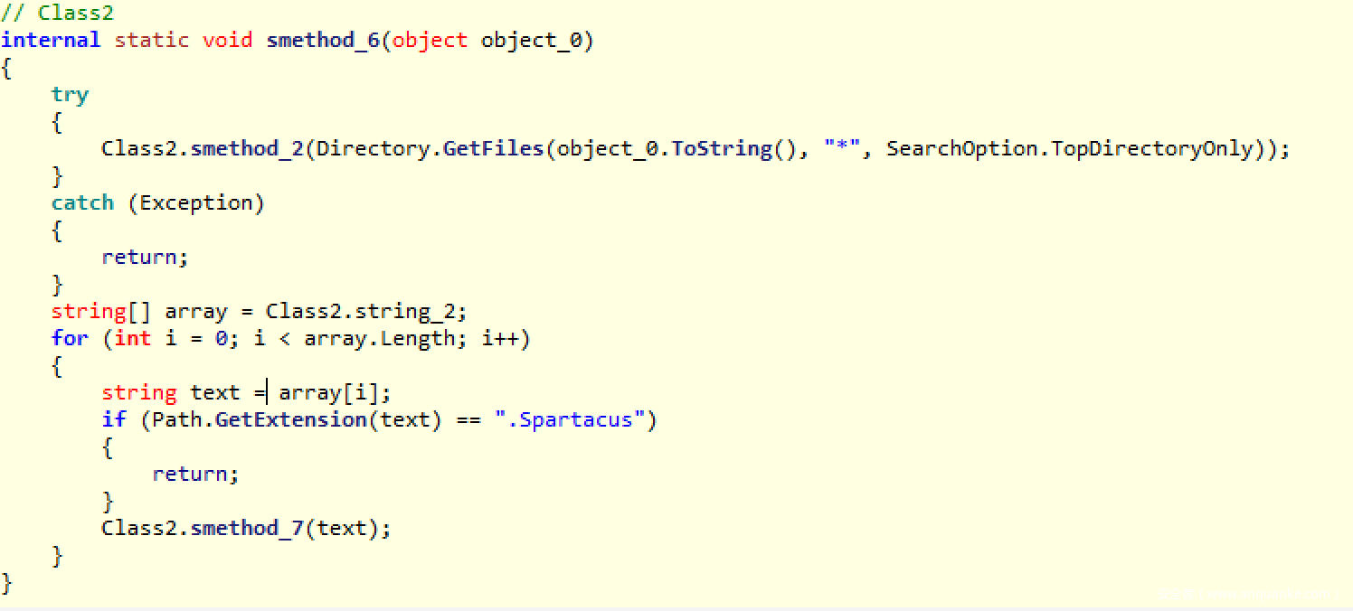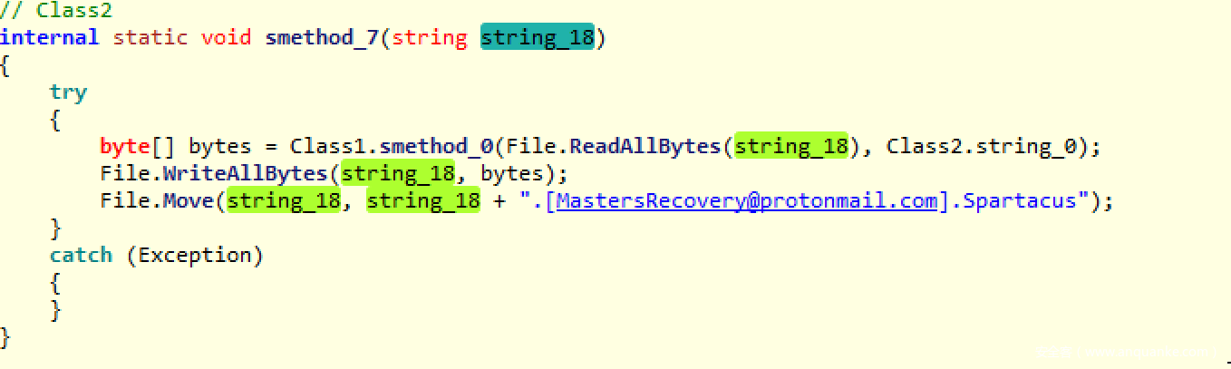 该函数调用smethod_0,它对原始文件数据进行加密,然后接下来的两行代码将加密的数据写入文件中,并使用.Spartacus扩展名对其进行重命名。提示:每个文件都使用相同的密钥加密,这个勒索软件不会将加密的AES密钥写入文件中,我们在其他的勒索软件中看到,它们执行唯一的文件加密。