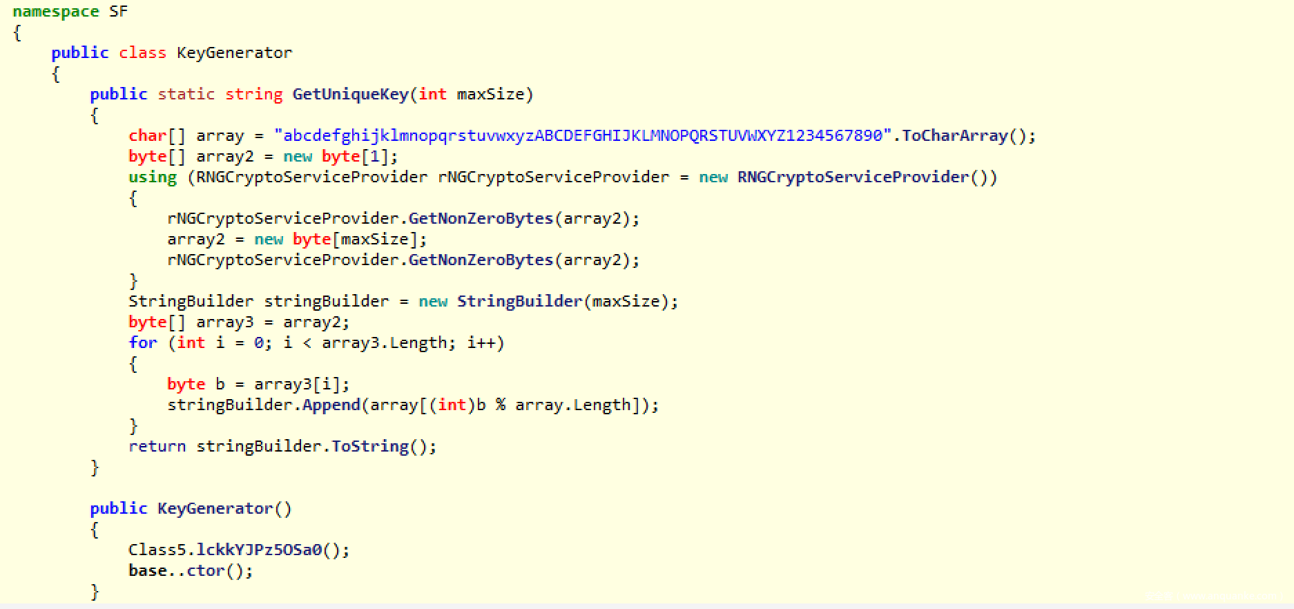 我提到的keygen函数是GetUniqueKey(),本质上,它只是使用RNGCryptoServiceProvider.GetNonZeroBytes API函数创建一系列加密的强随机数。然后它使用该系列的随机数作为字符集
