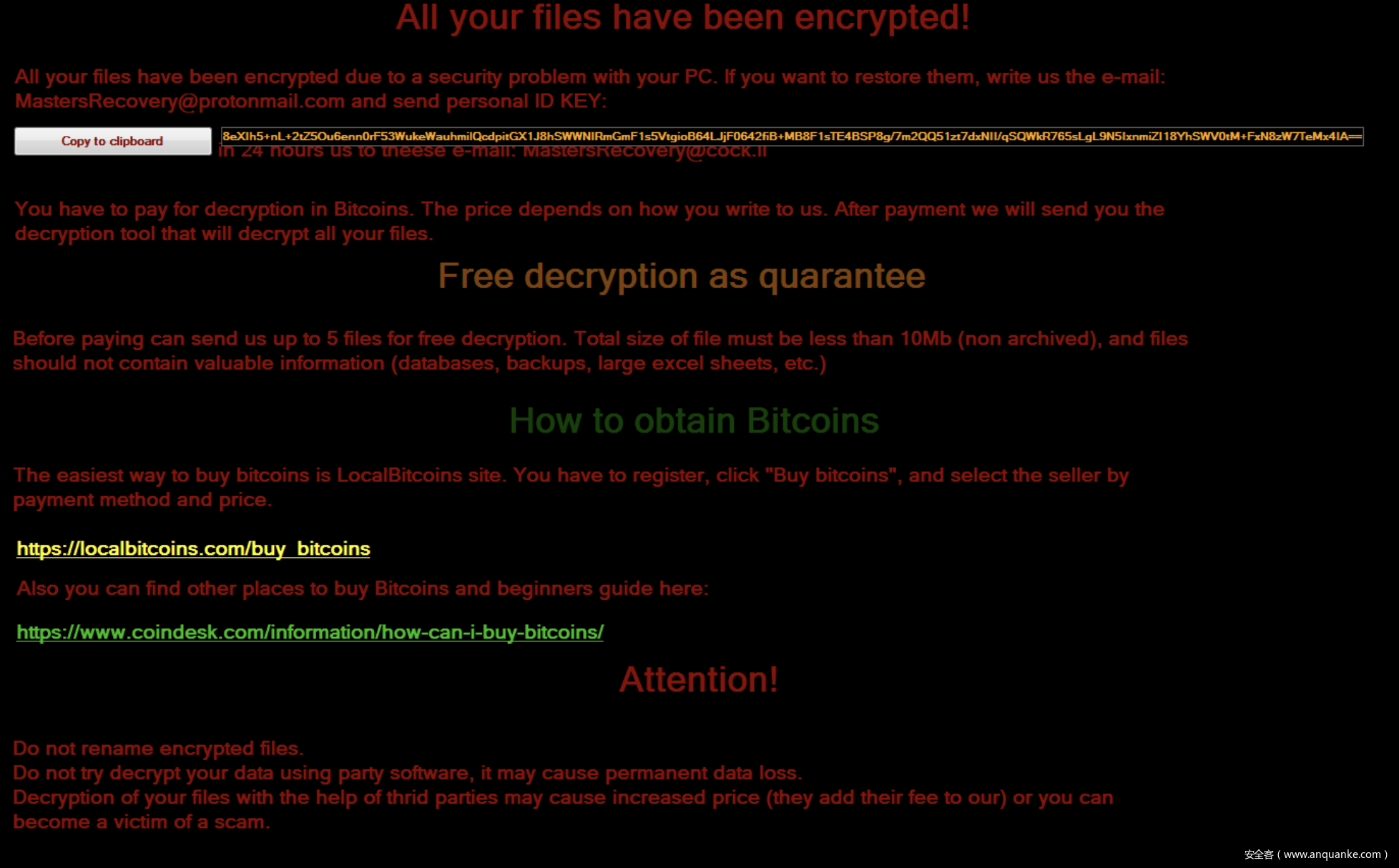 该密钥被保存并用于加密每个文件,这意味着两个相同的文件将具有相同的密码文本。AES密钥使用嵌入在文件中的RSA密钥进行加密。密码文本被编码并显示给用户在勒索信中。