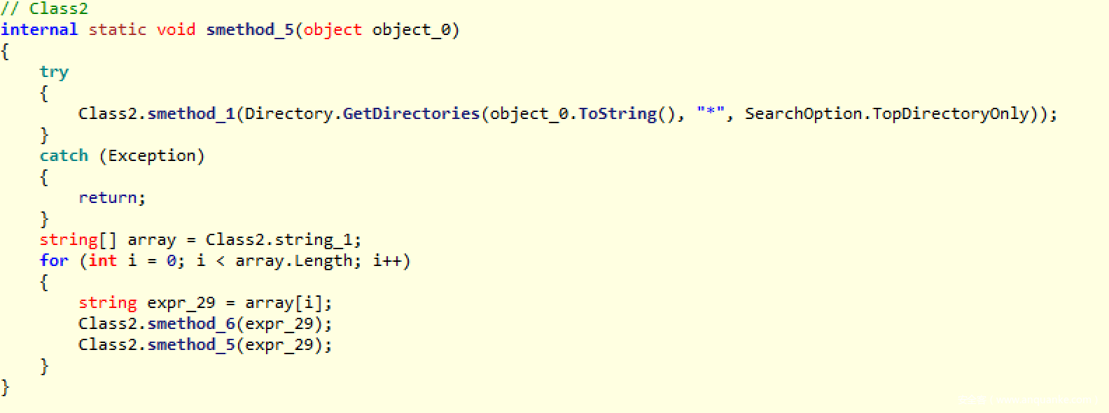 该功能对在构造函数中生成的特殊文件夹列表进行迭代,并开始使用smethod_6函数对文件夹中的每个文件进行递归遍历加密。这里要注意的一点是,加密循环不会区分文件类型或特殊文件。也就是说它会加密所有的东西。此外,还可以看到这里调用了smethod_1函数。但这可能是程序员的一个错误,因为它在程序的任何地方都没有使用。正如我前面提到的,smethod_6函数是执行加密的函数,smethod_5函数是一个递归函数,它将深入到任何位置的每个子文件夹中,然后在每个迭代中调用smethod_6来加密该子文件夹中的文件。