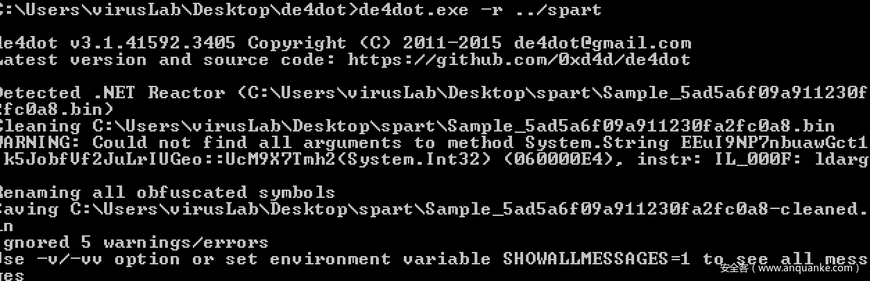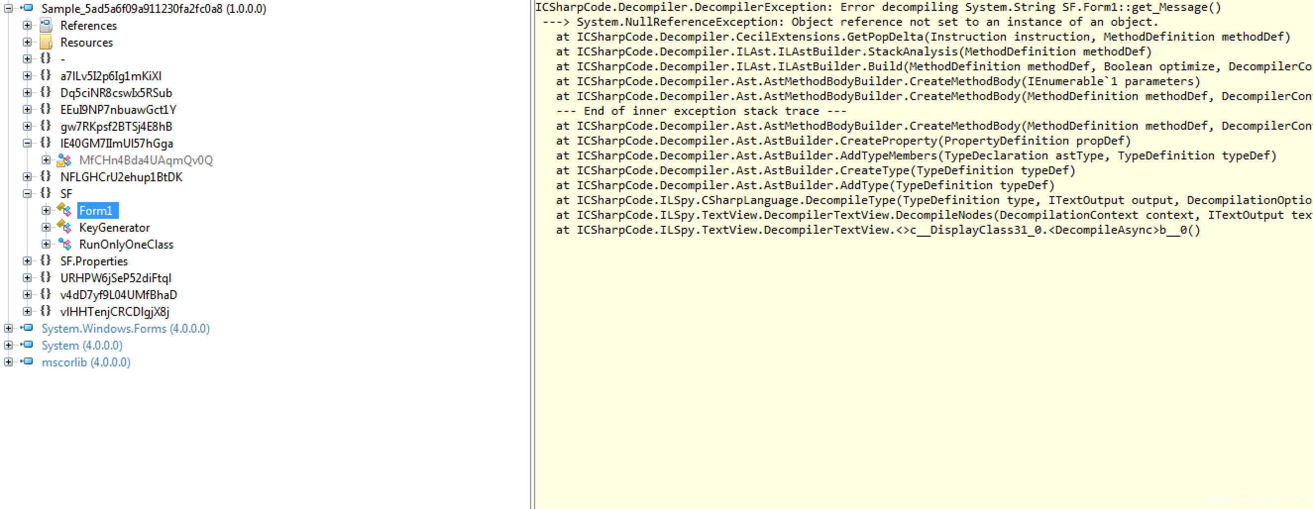 这些函数的代码是不可见的,正如你所看到的,所有的东西都是混淆的。一般在这种情况下,我喜欢使用de4dot工具。它将处理文件并输出可读版本。-r标志是您设置目录的位置,其中包含混淆的.NET示例。
