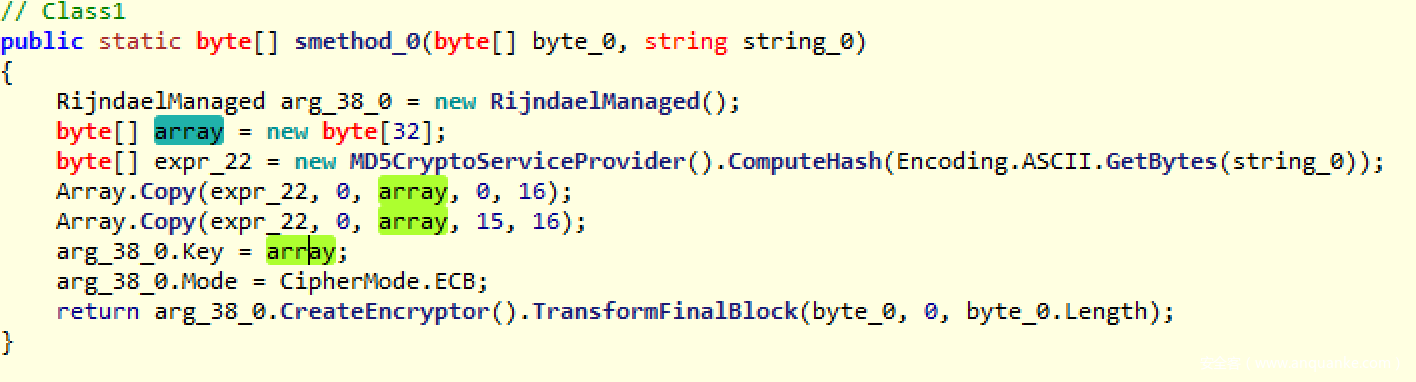 array =“abcdefghijklmnopqrstuvwxyzABCDEFGHIJKLMNOPQRSTUVWXYZ1234567890”的 索引来构建一个唯一的字符串。这是AES密钥,它将加密所有运行的文件。