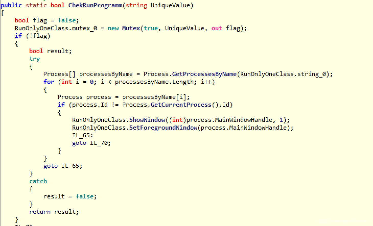 它首先要确保系统上只运行该恶意软件的一个实例。这是通过CheckRunProgram函数来实现,除此之外,它还创建一个互斥锁并确保它是唯一的。