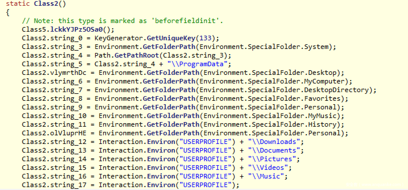 检查完成后,它会在一个线程中执行 smethod_3。在调用smethod_3开始之前,这个类的构造函数会自动调用,并设置所有私有成员(变量),其中包含要搜索和加密的所有特殊文件夹。它还使用KeyGenerator.GetUniqueKey(133)函数生成对受害者来说唯一的AES密钥。并在勒索软件中被引用以开始文件夹遍历。特殊文件夹可以在下面查看
