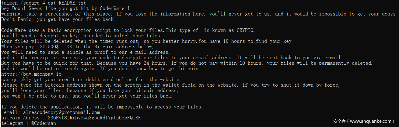 在应用屏幕显示勒索文档,要求用户支付500$比特币,不然文件将在10小时后被删除,代码内并未发现10小时后删除文件的行为,用户支付比特币后便可获得解密密钥和代码。