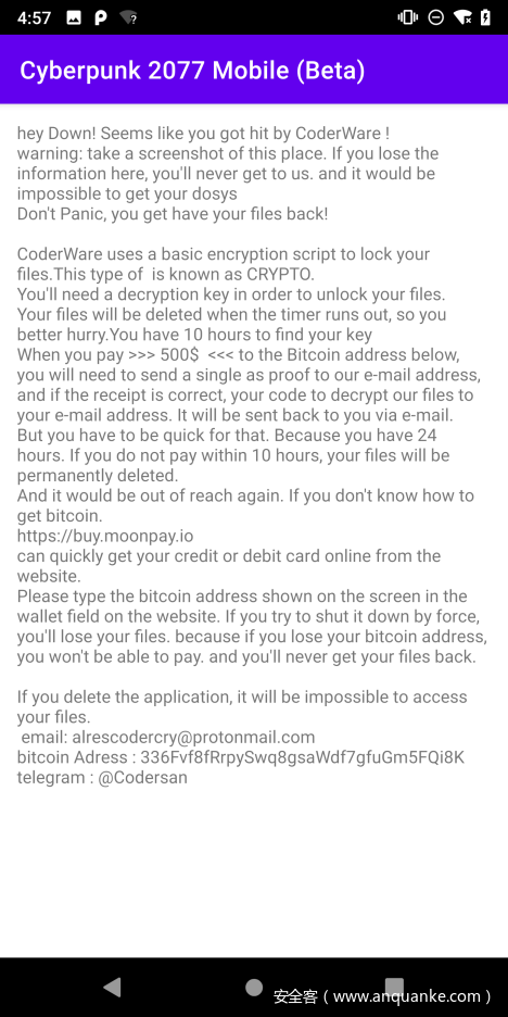 黑客对正版Cyberpunk2077应用进行了反编译,并对内部代码进行了修改,加入了勒索恶意代码。