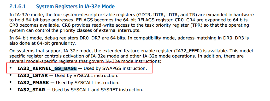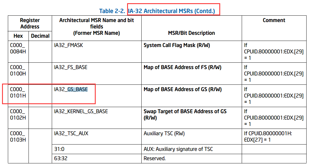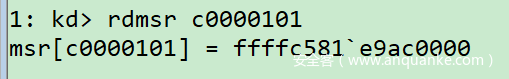 2、执行swapgs指令,swapgs指令的作用就是从MSR中读取出GS段的基地址。因为GS在用户态中指向的数据结构是TEB,而进入内核之后,GS需要指向KPCR,那这个地址在哪呢?在MSR中,如下所示: