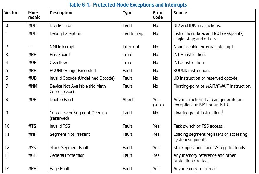异常是谁先发现的?【注意,此处说的是异常不是中断,中断和异常最好当作两个不同的对象处理,是有本质区别的】当然是CPU,以断点为例子简单说明其过程。CPU内部的取指单元从总线中取到下一条将要执行的指令,交友译码单元进行译码,然后交给EU单元即执行单元进行执行,EU单元一看,喔嚯,是0xcc,这是个断点异常啊,赶紧的,把这个情况给OS报告下?咋报告?当然是用软硬件协商好的IDT表了,先看下intel cpu定义的这张表,