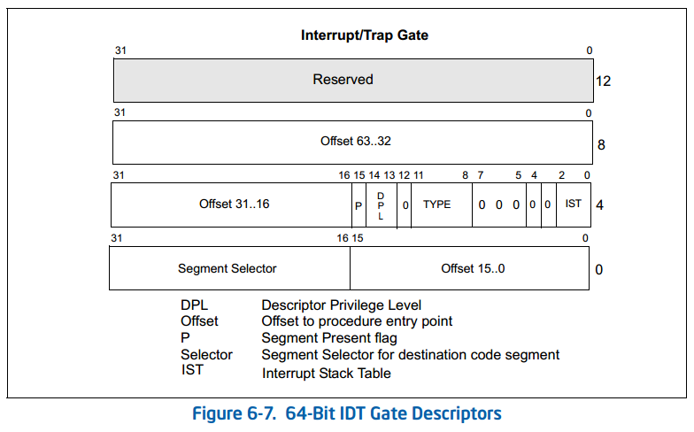 只有一个字段需要解释,那就是IST,解释这个之前大家先考虑一下这个问题:用户态中断发生时,CPU需要切回到内核态,而内核态的栈必然与用户态的栈是隔离的。【大家伙考虑下,如果栈不隔离,会不会有安全问题?】既然需要切换栈,那么栈地址的位置是怎么找到的呢?提示下大家int 2e陷阱门进内核时,内核栈是怎么提供的,syscall快速指令进内核是,内核栈是如何通过MSR寄存器提供的,留作大家的作业吧。这里的IST是另外一种方式提供内核栈。